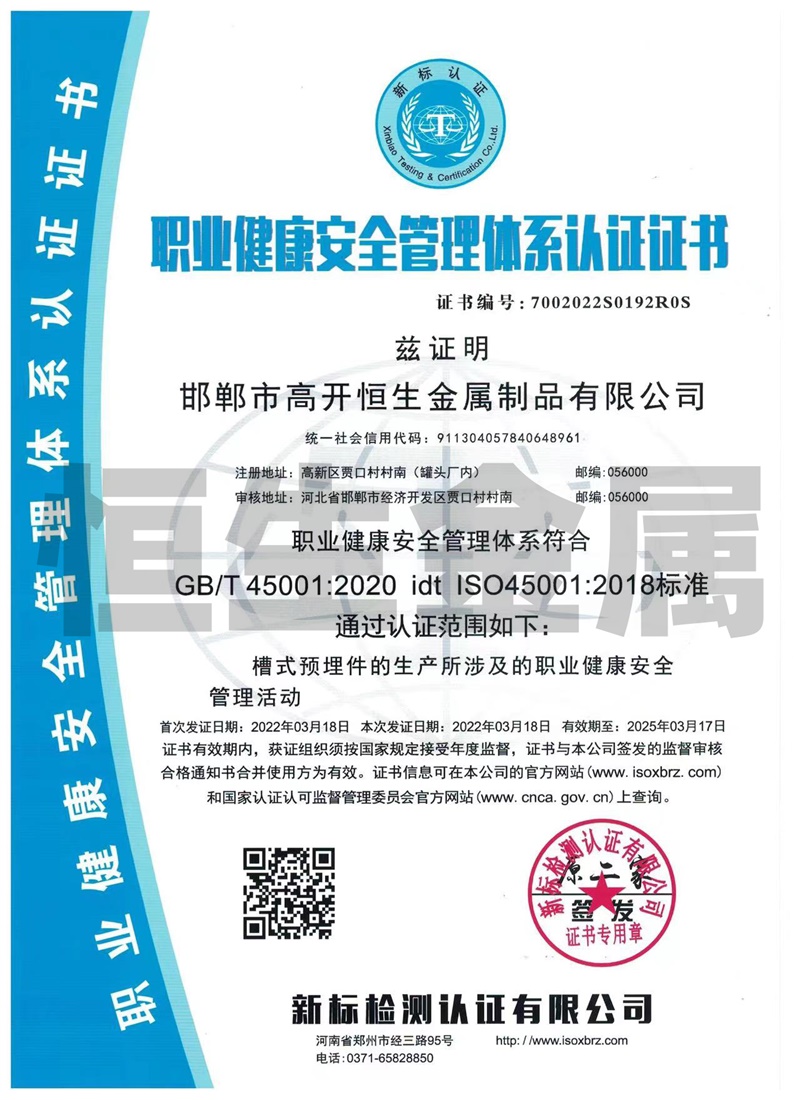 邯鄲市高開恒生金屬制品有限公司總部設在鋼城河北邯鄲,西鄰京廣線、東臨京深高速,地理位置優(yōu)越,交通比較便利。 我廠擁有多年生產預埋槽道的產品生產經驗,專業生產鍍鋅防腐槽型預埋件系列產品,其中產品包括:高開恒生哈芬槽、哈芬槽鋼、預埋槽道、預埋滑槽、帶齒預埋槽鋼、槽式預埋件、工字鋼材料、C型槽材料配套的T型螺栓,也可根據客戶需求按圖訂做加工,產品廣泛應用于隧道、城市軌道交通、地下綜合管廊、建筑幕墻施工工程。
